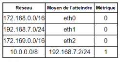 Table de routage: Comme vous pouvez le voir ci dessous les tables de routage vue en cours sont constituer d'un réseau (adresse ip et sont masque), d'un moyen de l'atteindre et d'une métrique. Chaque routeur possède une table de routage qui contient les informations permettant d'envoyer un paquet de données. (Il y a plusieurs fois le même réseau car il y a plusieurs moyens de l'atteindre).